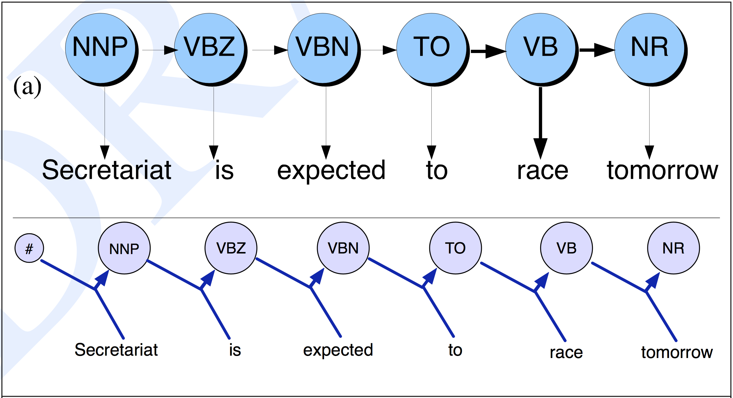 $p(y_t|y_{t-1},X)=\frac{1}{Z_t(y_{t-1},X)}exp[\sum_{k=1}^{K}\theta_kf_k(y_t,y_{t-1},X)]$