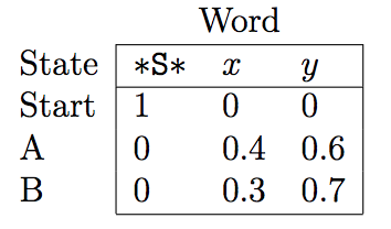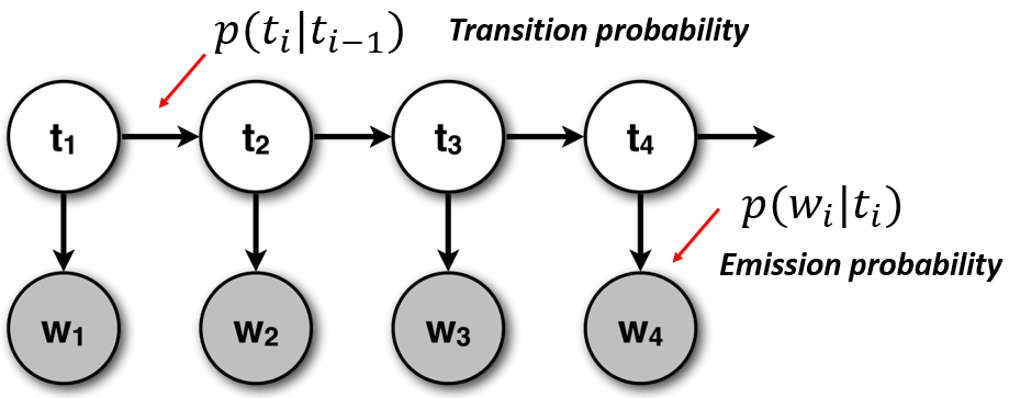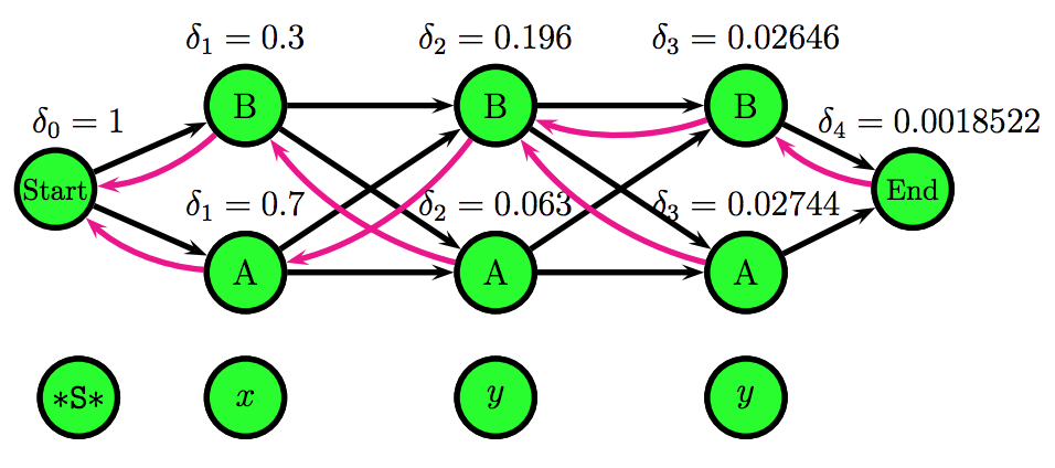 $$\delta_{i}(t) = \underset{t_{i-1}}{\max} \ \ P(t \mid t_{i-1}) \cdot P(w_{i-1} \mid t_{i-1}) \cdot \delta_{i}(t_{i-1})$$