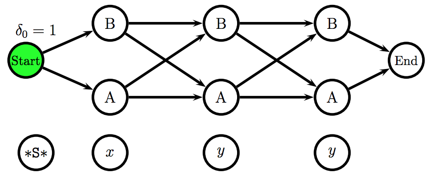最可能的在位置 $i$ ,以状态 $t$ 结束:$$\delta_{i}(t) = \underset{t_{0},\ldots,t_{i-1},t}{\max} \ \ P(t_{0},\ldots,t_{i-1},t,w_{1},\ldots,w_{i-1})$$